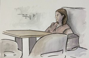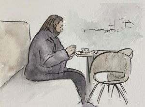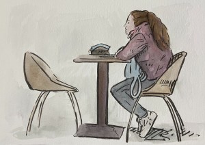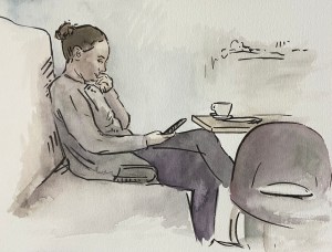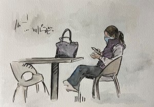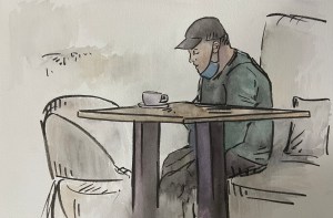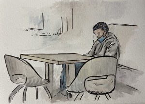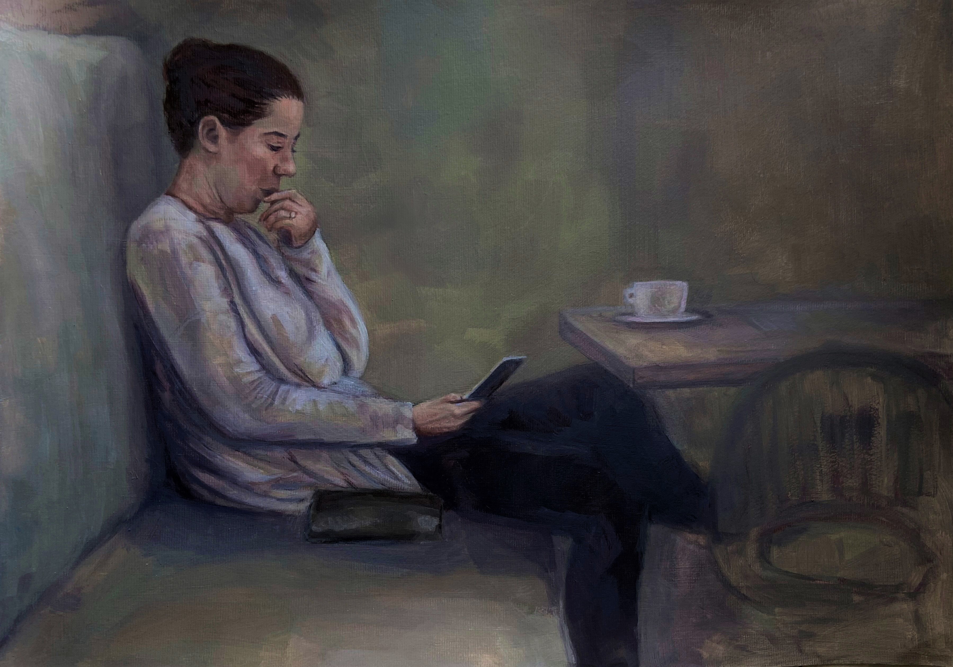A series of watercolour observational paintings were done featuring isolated people in coffee shops. These were later transformed into oil paintings in an attempt to document this new normal and the artist’s experience of it. The figures act as a symbolic stand in for the artist as she is projecting my feelings and mood onto them. This however, does not necessarily mean that the subjects were experiencing their reality in the same way.
