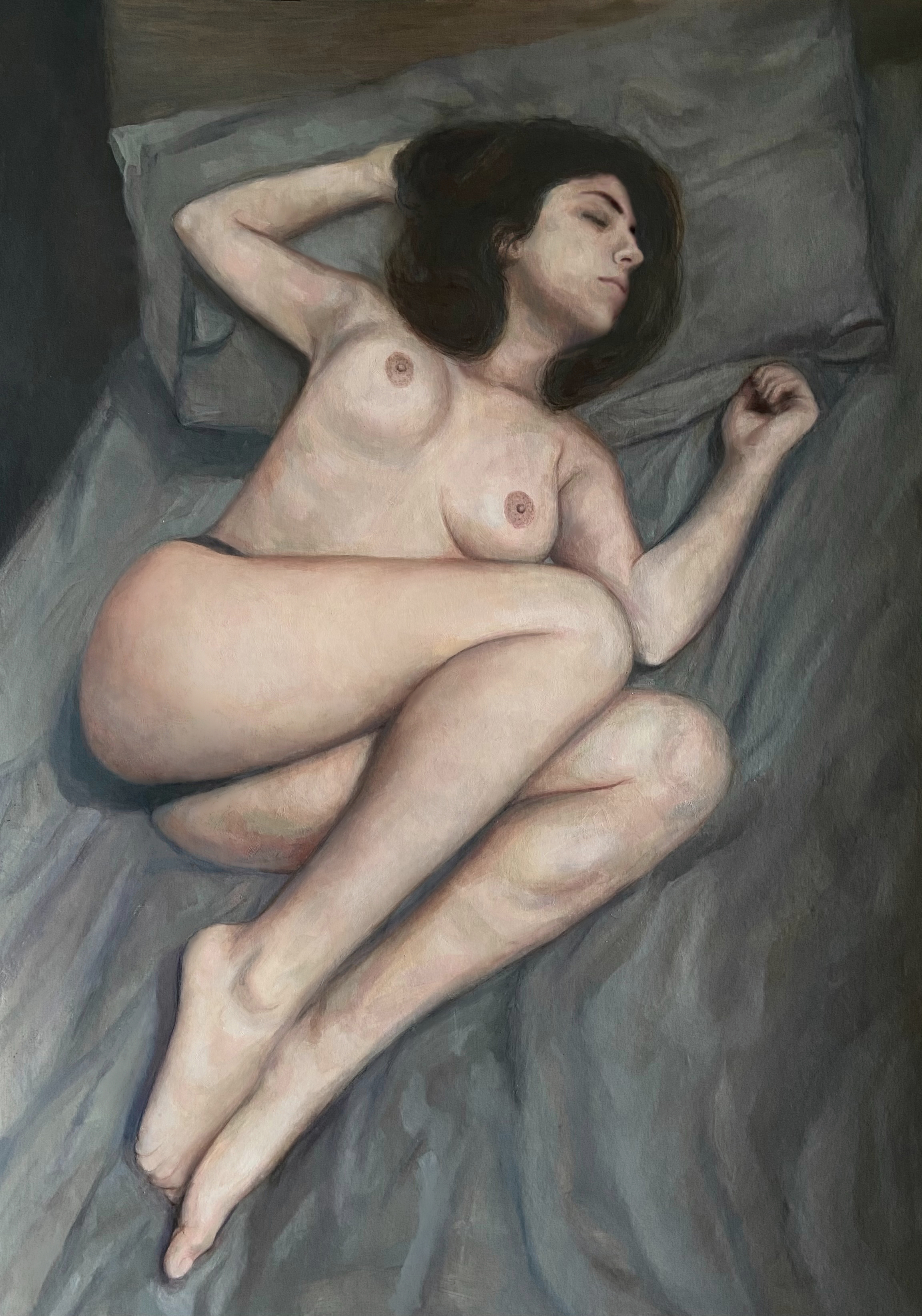 The series of two paintings consist of a woman portrayed in the most vulnerable role of being asleep and watched by the artist. The serene sleeper is endowed with raw and sallow skin, to emphasize on the naked truth. The surrounding background with its colour and darkness harmonizes with the youthful model. When you’re painting someone sleeping, there is a degree of verism, where one is intruding almost on someone’s very private moment. The close framing reinforces the impression of privacy. Seen from a high viewpoint, the artist and the viewer respect the silence, even in painting, where the female is sleeping, as a way of escaping reality for a moment.